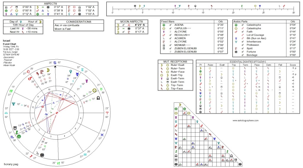 If we consider the chart for the Israeli nation, we do notice some striking points of interest. It should be stated here that there is some controversy over whether to use the time of 4pm or 4:37pm for the birth of the Israeli nation, depending on which version of events you believe.[1] I have chosen 4pm, although the temptation to go with the latter, which has Scorpio rising, is very appealing under the circumstances.