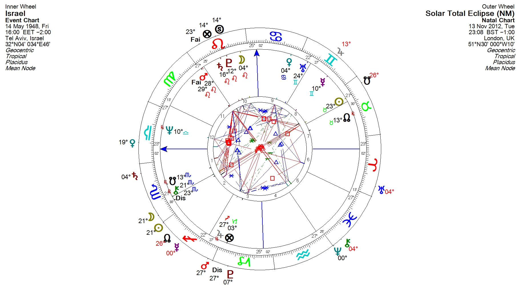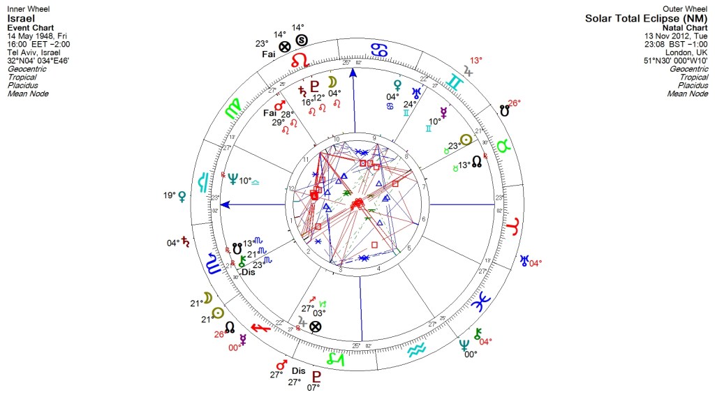 At any rate, what we do find is that, regardless of the Ascendant, the eclipse occurs at 21-22 degrees Scorpio which is both conjunct Israel’s natal Chiron (memories of religious persecution arising from events such as the Second World War) and opposite Israel’s Sun at 23 degrees Taurus. This on its own, evokes a story of conflict revolving around a deep and abiding need for homeland security (Sun in Taurus) undermined by fears of obliteration from its Arab neighbours, some of whom have openly expressed the desire to wipe it from the face of the earth.
