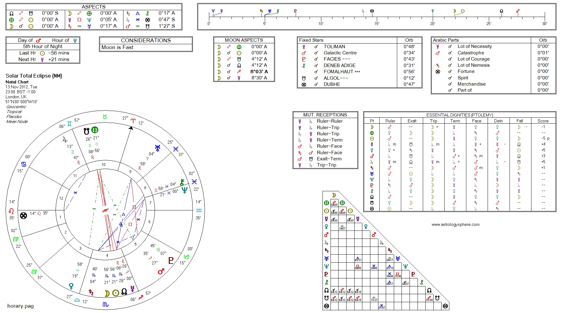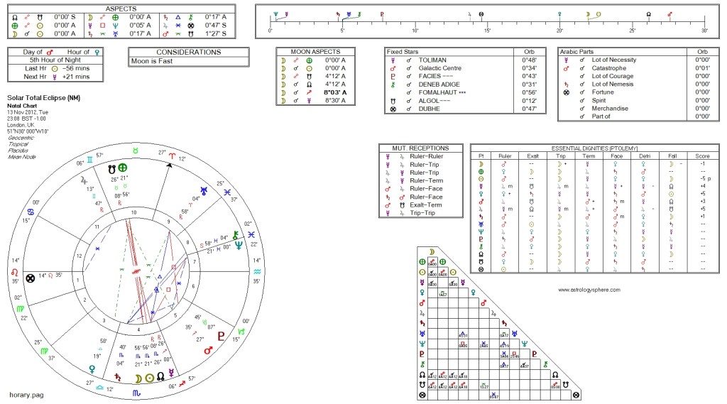 The eclipse, taking place as it does in Scorpio, (and therefore in Israel’s 2nd house) does, in and of itself, seem highly resonant of the situation, depicting a struggle for territorial supremacy. The killing of a male leader (in this case, Ahmed Jabari) is not only fitting of a solar eclipse, but also brings out the theme of revenge or retribution – a major element of this particular conflict – as well as the tendency to overreact and be especially harsh, uncompromising and unforgiving in the way one reacts to a challenging situation – all fairly typical of the sign of Scorpio.