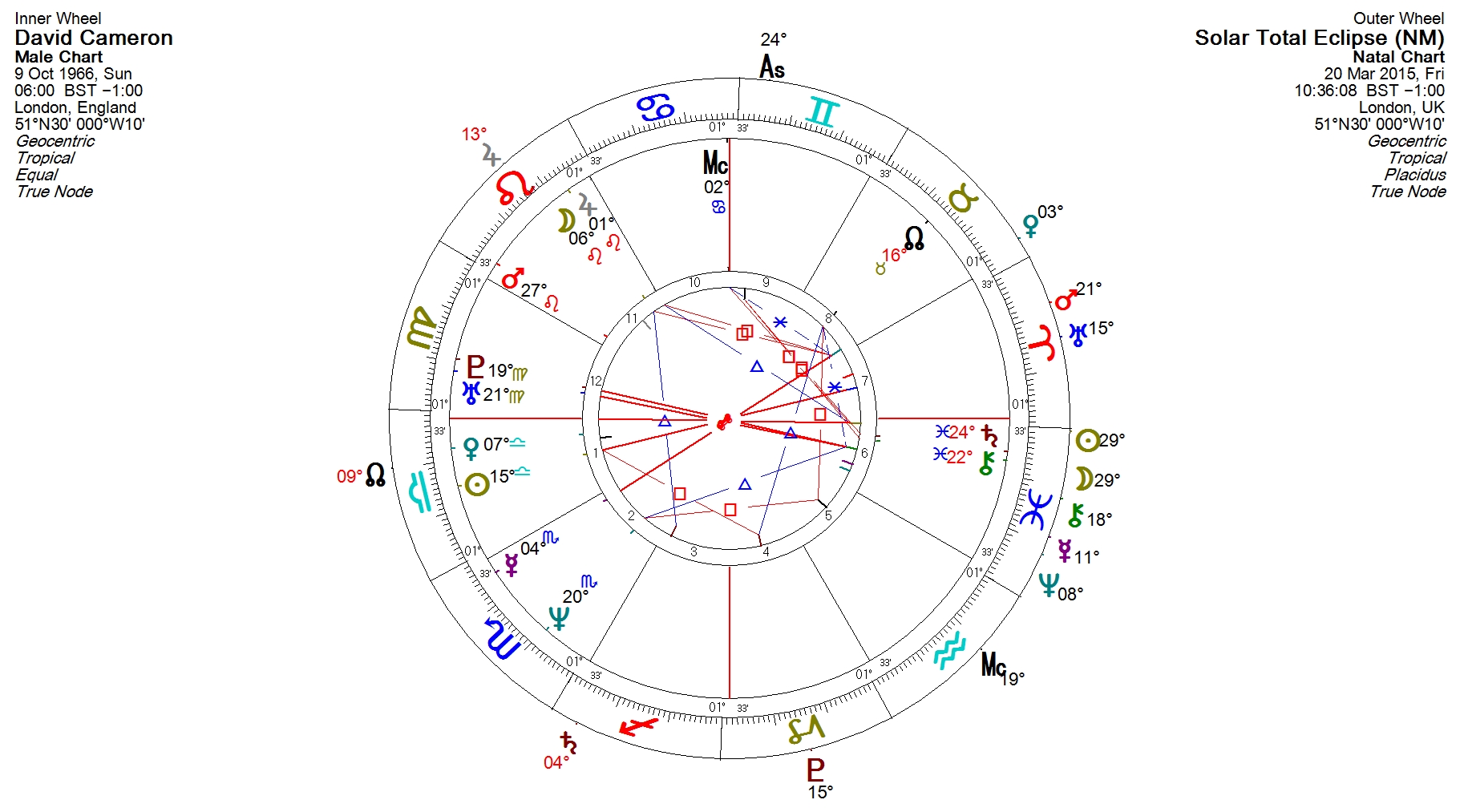 Again, this doesn’t look so good for David Cameron. If we look at the March 2015 solar eclipse chart transposed onto David Cameron’s natal chart, we see the Sun and Moon in Pisces are conjunct his 7th house cusp – both allies and enemies are represented by the Descendent, so which of these prospects are we looking at here? Given that both are in his 6th house of work/health, and that they square his Midheaven (positions of public office), it does look as though he may lose his job as Prime Minister.
