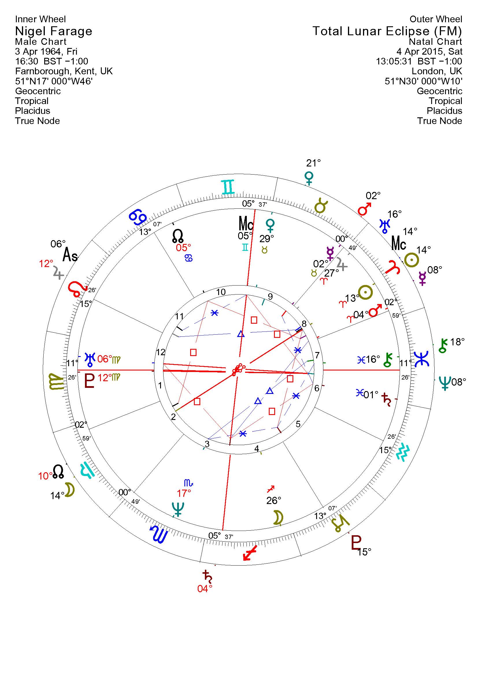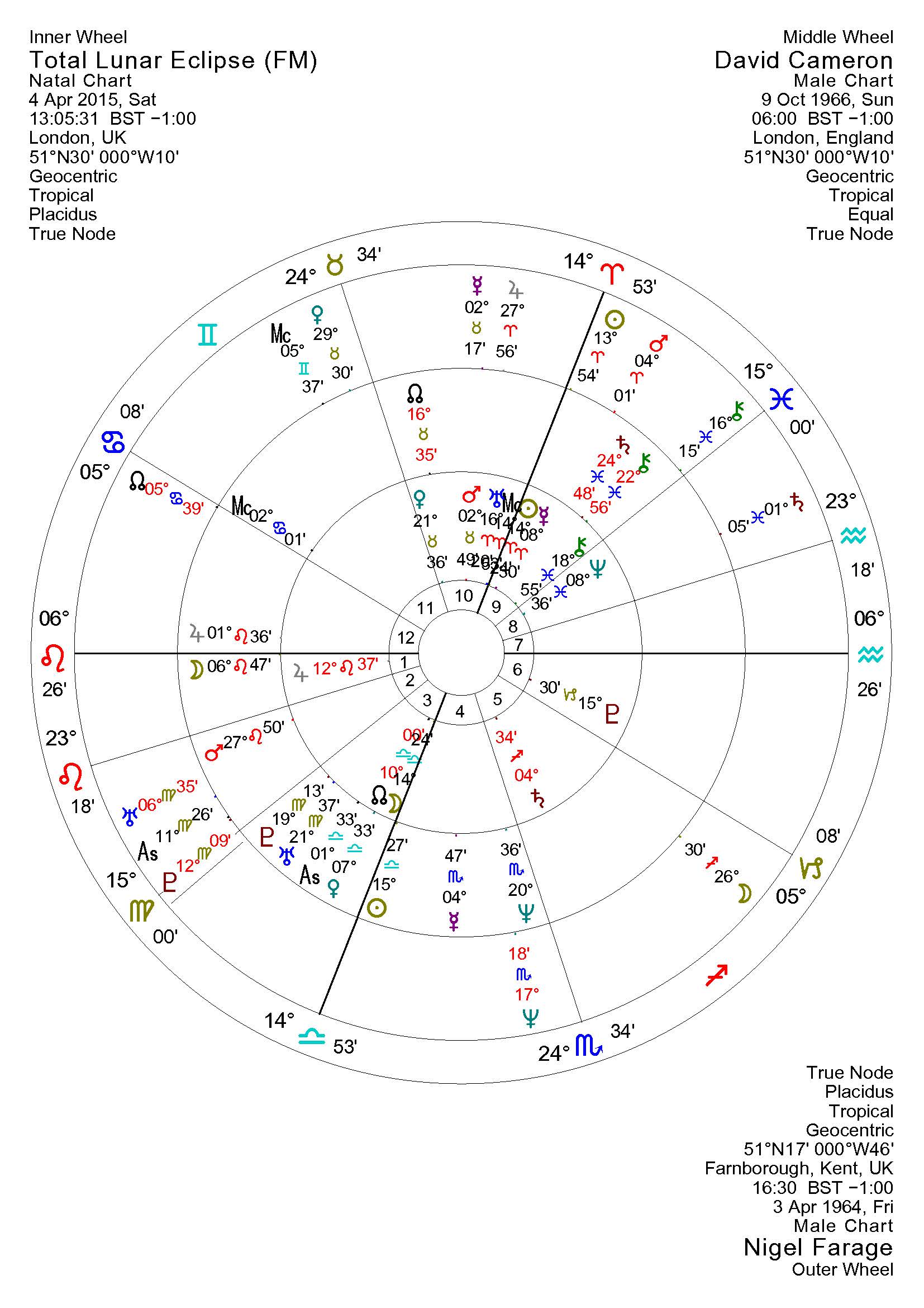 In fact, if we transpose Cameron and Farage’s natal charts onto that of the 2015 Lunar Eclipse chart, we see that both politicians’ Suns are within 1 degree of the eclipse Sun & Moon respectively, so very close in terms of orb. Furthermore, Cameron’s Sun happens to be conjunct the IC of the eclipse chart. In symbolic terms, this puts Cameron on the nadir – the darkest part of the chart – not great for the light-loving Sun. This could suggest that his personal power and influence are on the decline.