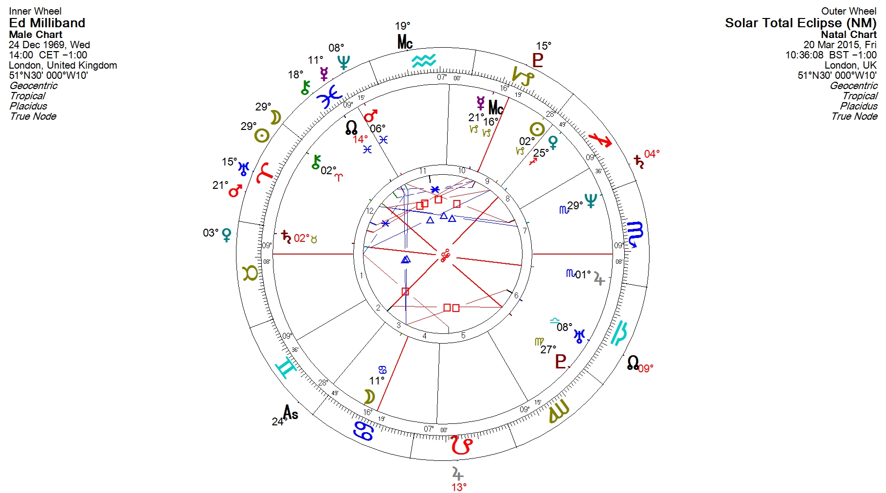 In terms of the solar eclipse, we have the Sun and Moon in Pisces in Ed’s twelfth house of psychology, secrets and hidden enemies, perhaps suggesting that he is a bit of a dark horse. With his plodding Taurus Ascendant and serious Saturn rising, I think that Ed is often underestimated. The Sun and Moon are also conjunct Chiron – and certainly, during this election, he has really had to stand up and defend himself in public, especially with regards to the general sentiment that he comes across as a weak leader (Chiron) and is not a patch on his brother, David, who he notoriously stabbed in the back during the 2010 Labour leadership contest – a very stealthy, 12th house move that may have made people feel that, ultimately, he isn’t trustworthy! With his natal Sun in Capricorn in the 9th house, Ed is definitely a conviction politician and with the eclipse trining idealistic Neptune in the 7th house of his chart, it is certainly possible that he will win votes based on his stance on issues, rather than his sparkling and charismatic personality.