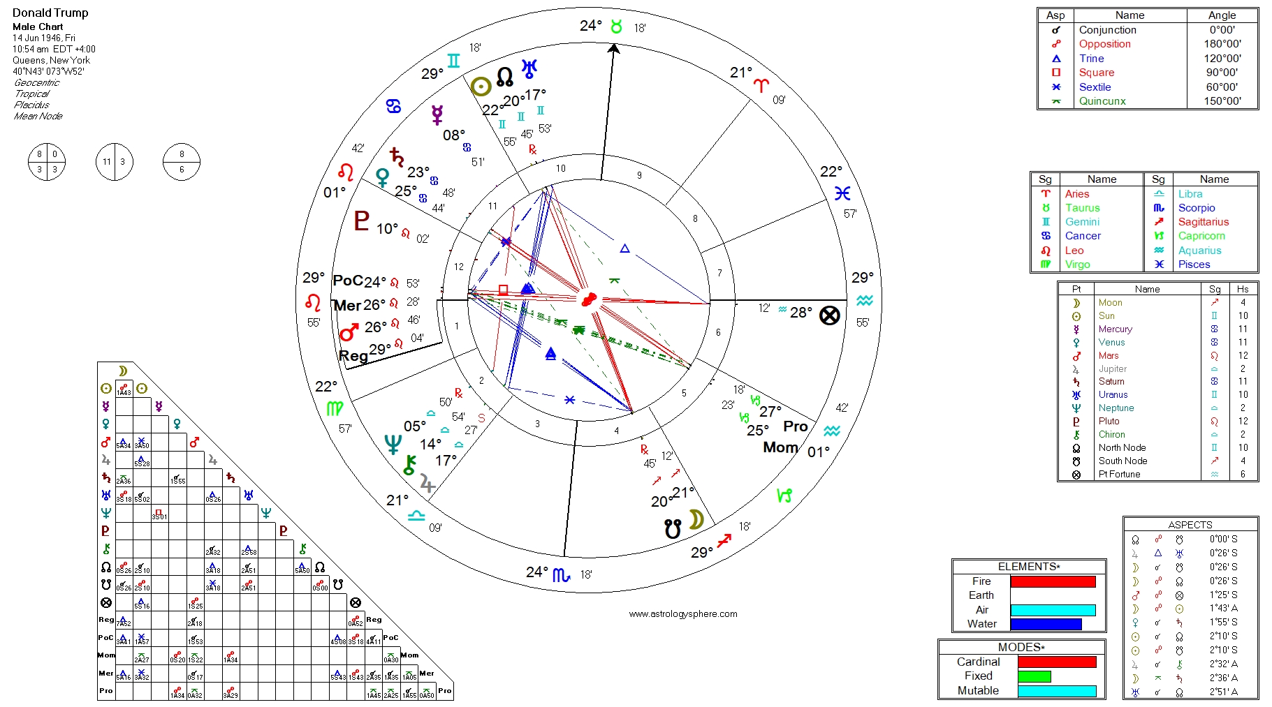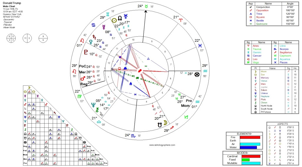 For those of you who haven’t read his profile, which I originally created in early 2017 before his first presidential inauguration, here is an updated breakdown of his natal chart, along with some key points on just who he is and what makes him tick…