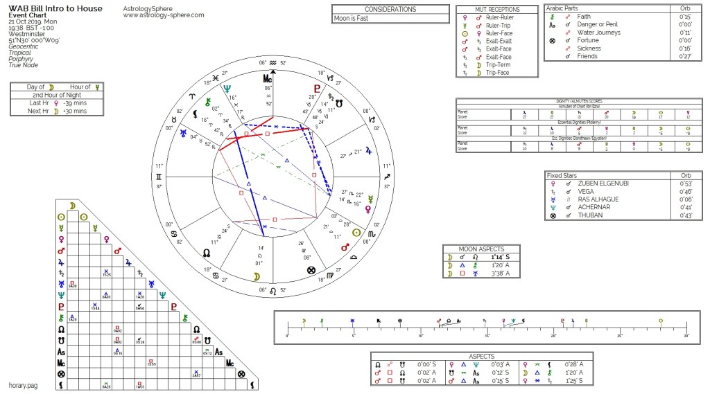• Mercury is in Scorpio in the 6th house of ‘ordinary proceedings’ showing the Bill has just been introduced to the everyday business of the House of Commons. Now the interesting thing about this Mercury is that, after it’s sextile to Pluto on Saturday, it will only make one more aspect – that conjunction to Venus on the 30th – before turning retrograde on Oct 31st – yes that’s right, on Halloween itself! Spooky! Now this in and of itself suggests that the Bill will not pass – unless Venus can bring something to the party (via the sextile to Pluto) before Mercury’s reversal happens.