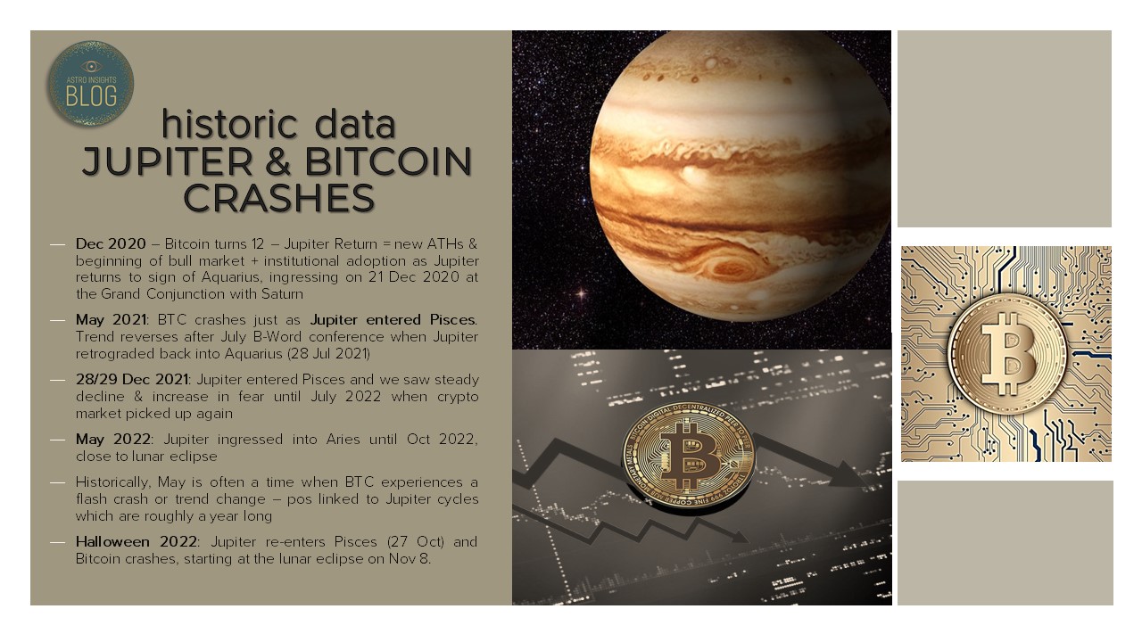 And here we are, just two weeks on, and the market is experiencing another spectacular cryptocrash, similar to the one the market experienced back in May 2021 – an event that happened within a day of two of a retrograde Jupiter re-entering the very same sign.