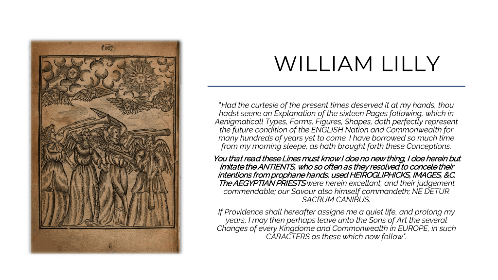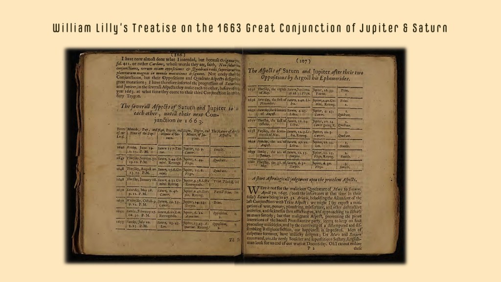 Later that same year, Lilly released England’s Prophetical Merlin, in which he offered predictions concerning the Great Conjunction of Jupiter and Saturn, an apocalyptic-laden event widely perceived to be an omen of England’s future.